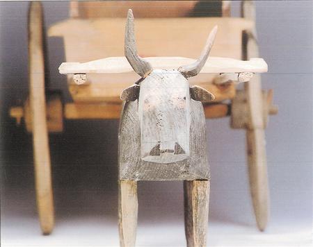 木牛俑高度約20厘米左右,通常先雕出輪廓,然后通體飾黑彩,白彩勾眼和絡(luò)頭等。從造型來看,木牛目視前方,屈背,四足蹬地,身軀健壯有力。拉著牛車或拉木犁的牛俑一般繪有絡(luò)頭,表現(xiàn)了田間勞作的情景。到西漢時期,隨著“軍事屯田”與“徙民實邊”政策的推行,牛耕技術(shù)在甘肅河西地區(qū)逐漸普及開來。