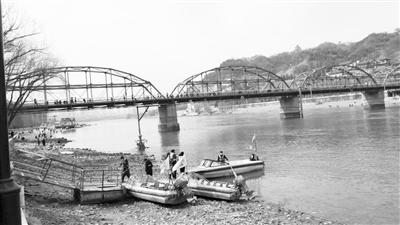 如果時(shí)光回到抗戰(zhàn)時(shí)期,也是這個(gè)地方,遠(yuǎn)處人們在取水,近處幾個(gè)筏工在忙碌著。