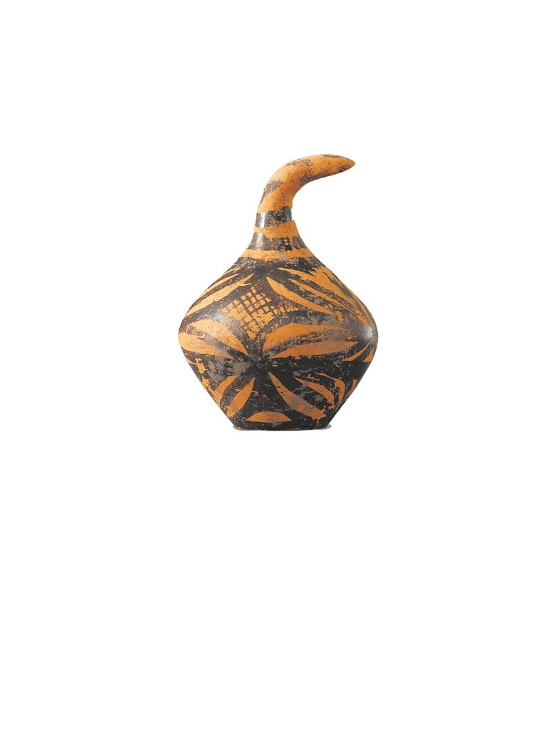 菱形網(wǎng)紋曲柄彩陶鈴 馬家窯文化馬家窯類(lèi)型(距今約4800年),廣河縣祁家集出土。這件陶器看起來(lái)很奇特吧,若不是器身略鼓的腹部,幾乎就是歪嘴葫蘆的形狀。這件陶器腹部是中空的,里面裝著些小陶丸或小石子,搖晃起來(lái)沙沙作響。這件彩陶是干什么用的呢?其性能類(lèi)似現(xiàn)在給幼兒玩的鈴鐺,它應(yīng)該是原始的樂(lè)器。