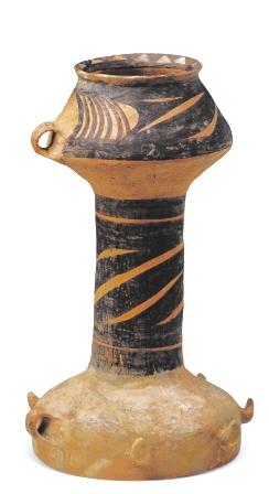 弦紋彩陶鼓 馬家窯文化馬家窯類(lèi)型(距今約4800年),永登縣出土。這是一只陶鼓,鼓的兩端各有一耳,用于系繩,一端為喇叭口,另一端為罐形口,喇叭口外有六個(gè)爪突,用于固定鼓面。想必是用緊繃的獸皮做鼓面,這應(yīng)是腰鼓的雛形,是迄今為止發(fā)現(xiàn)時(shí)代最早的打擊樂(lè)器。