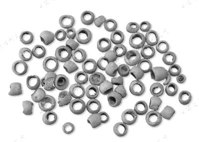 在出土的文物中,有一件連珠紋釉陶杯。這是一件玻璃態(tài)水杯,出土時人們還發(fā)現(xiàn)了一些疑似杯子的殘片,在同一墓坑中還同時出土了大量料珠。這個玻璃態(tài)水杯紋飾獨特,通體藍色釉飾,底部手握處,竟然設(shè)計有7圈珠紋。顯然,這些凸出的珠紋,除了美觀外,還可以增加摩擦,避免杯子從手中滑落,當然也不排除珠紋還有其他含義。