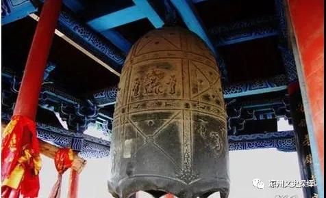 大云寺古鐘,高226厘米,口徑115厘米,厚12厘米,重約6噸,懸掛于武威大云寺鐘樓上。其鑄造時(shí)代傳說各異,或云前涼張?zhí)戾a時(shí)所鑄,或云為唐代遺物,而最晚者謂鑄于五代。