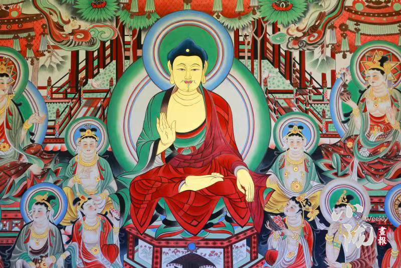 近日,一副長15米、高6米的大型臨摹復(fù)制敦煌壁畫《無量壽經(jīng)變》在武威鳩摩羅什寺完美竣工,將于近期對外開放。
