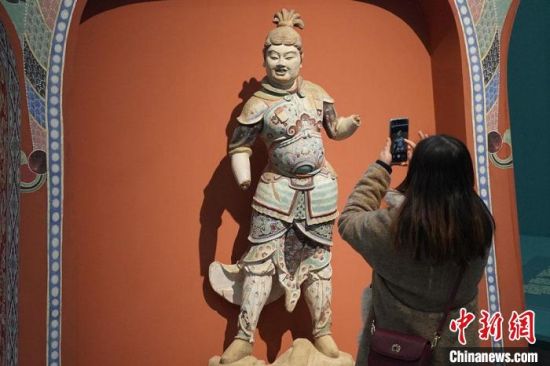 圖為觀眾參觀彩塑臨摹品?!【琶赖┰?nbsp;攝