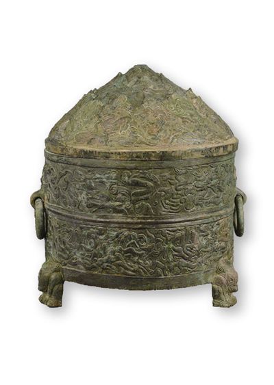 樽為古代盛酒的器具。李白《行路難》云:“金樽清酒斗十千,玉盤珍羞直萬錢。”考古發(fā)現(xiàn)的酒樽最早出現(xiàn)在戰(zhàn)國時(shí)期,漢代酒樽常與杓、承盤等酒具配套使用。此件銅樽裝飾紋飾繁縟華麗,制作工藝精湛細(xì)膩,是東漢青銅冶煉技術(shù)的杰出代表。