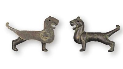 銅虎符(圖③)高4.7厘米、長6.9厘米?;A豎耳,怒目張口,挺胸昂首,尾上翹,作奔走狀。符頭部有圓穿孔,背面有凸起的十字扣。符身正面陰刻篆書“永安府”字樣,背面陰刻楷書“右翊衛(wèi)”“右驍衛(wèi)”“永安四”“蘭豐二”等字樣。右翊衛(wèi)、右驍衛(wèi),官署名,為隋唐十六衛(wèi)中的兩衛(wèi)。隋初稱左右衛(wèi),隋煬帝時(shí)改為左右翊衛(wèi),所領(lǐng)軍士稱驍騎。館藏虎符出土于甘肅莊浪,是隋代府兵駐防莊浪的歷史見證,是研究隋代府兵制度的重要實(shí)物資料。