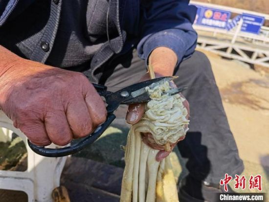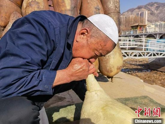 2月24日,春日暖陽下,今年70多歲的省級(jí)羊皮筏子非遺傳承人張德寶在蘭州黃河邊制作羊皮筏子,為迎接旅游旺季到來提前做好準(zhǔn)備。劉玉桃 攝