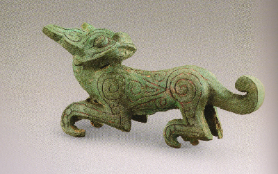 禮縣大堡子山祭祀樂(lè)器坑出土,共三只,造型相同,大小相似,為全國(guó)虎伴樂(lè)器出土的首例。其形象回首卷尾、聳耳曲爪、憨態(tài)可掬,極具觀賞性,是春秋時(shí)期虎造型的杰作,體現(xiàn)了秦國(guó)早期高超的造型能力和精湛的鑄造技術(shù)。虎的形象在春秋秦人的器物中多見(jiàn),不但有自成個(gè)體的金虎、青銅回首虎,同時(shí)虎作為附飾也出現(xiàn)在一些大的青銅器上。