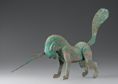 獸頭向前沖,角向前刺,扁尾上翹,四足跨張作角斗狀,全身鑄有獸毛的紋飾。角和尾可拆卸。獨(dú)角獸是傳說(shuō)中的一種神獸,隨葬在墓中,起鎮(zhèn)墓辟邪的作用。