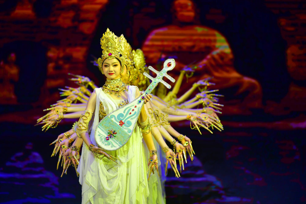 2021年9月24日,第五屆絲綢之路(敦煌)國(guó)際文化博覽會(huì)和第十屆敦煌行·絲綢之路國(guó)際旅游節(jié)在甘肅省敦煌市開幕。圖片為演員在開幕式上演出。新華社記者陳斌 攝