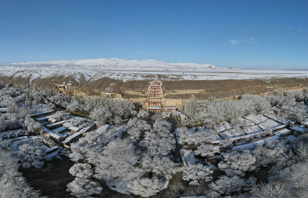 這是3月25日拍攝的敦煌莫高窟景區(qū)雪景(無(wú)人機(jī)照片)。新華社記者張智敏 攝