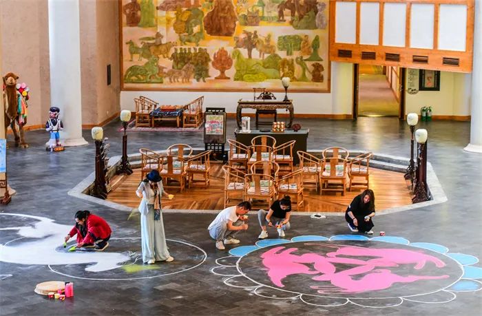 5月8日,母親節(jié),酒泉敦煌市沙文化館以敦煌莫高窟九色鹿壁畫為摹本,以彩色沙為原料,5人團(tuán)隊通力合作,在敦煌鳴沙山下的敦煌山莊大堂“繪制”出長10米寬6米的大型九色鹿沙畫,同時“繪制”了一幅“三兔藻井”沙畫圖案,寓意天下母親“福祿安康”“一路平安”,祝天下母親節(jié)日快樂。