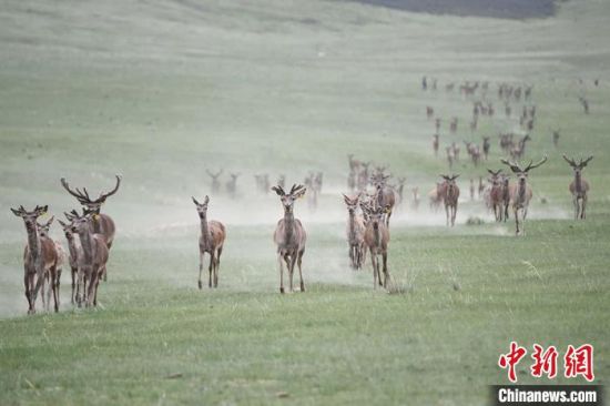 夏日時節(jié),位于祁連山北麓的甘肅省張掖市肅南裕固族自治縣,數(shù)百頭馬鹿在草原上崩騰、休憩覓食。 楊艷敏 攝