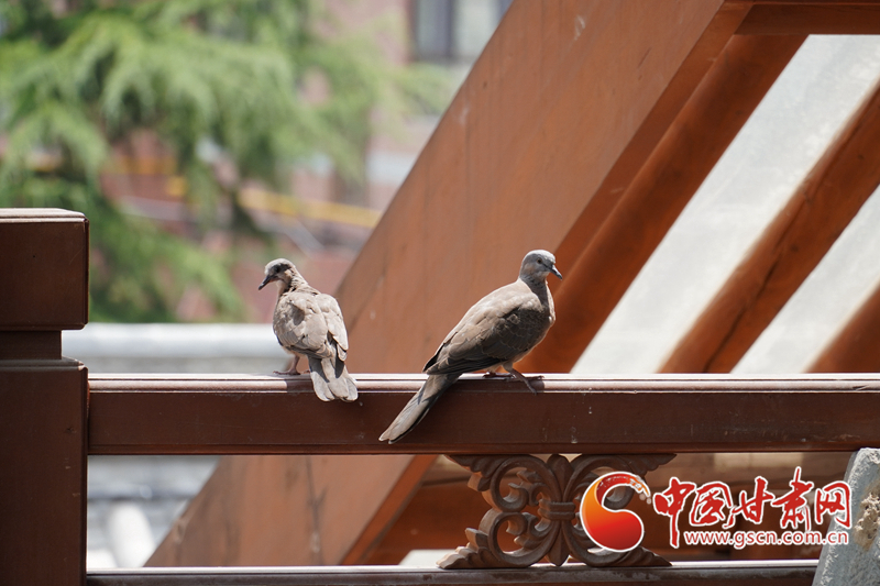 天水古城內(nèi),一只鳥(niǎo)飛向欄桿,隨后兩只鳥(niǎo)同在欄桿上站立不動(dòng)。