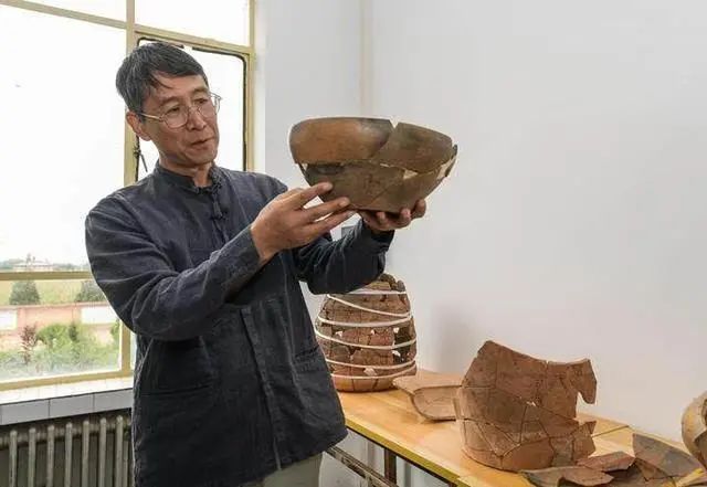 南佐遺址聯(lián)合考古隊領(lǐng)隊、中國人民大學歷史學院考古文博系教授韓建業(yè)在遺址研究基地內(nèi)展示出土的陶器(8月23日攝)。新華社記者 李賀 攝
