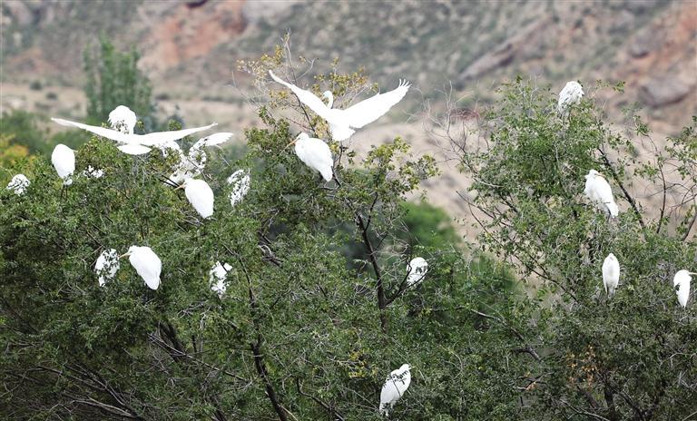 中國甘肅網(wǎng)10月14日訊 據(jù)蘭州日?qǐng)?bào)報(bào)道 金秋十月,蘭州新區(qū)秦王川國家濕地公園秋意漸濃。近日,隨著近百只白鷺的光臨,秦王川國家濕地公園再次迎來了候鳥遷徙的高峰期,成群的白鷺憩息在樹枝,繪就了一幅亮麗的秋景圖。