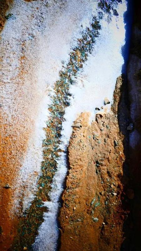 在丹霞山間可見一條冰凍似凍的水溪,系小泉河支流,在陽光下透過像東北冬天窗花一樣的冰花,可看見水下的鵝卵彩石,望遠(yuǎn)看去小溪像一條披上雪衣的彩龍。