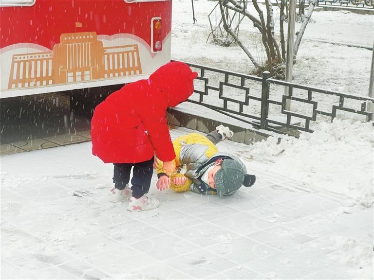 小朋友在雪地里嬉戲。 新甘肅照片
