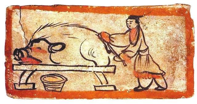 墓磚壁畫描述古人宰豬場景。