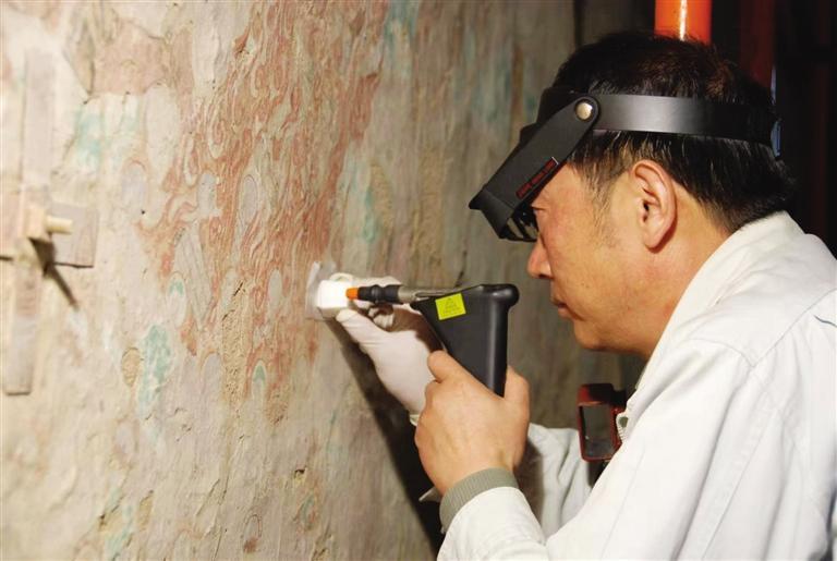 樊再軒研究員在修復(fù)壁畫