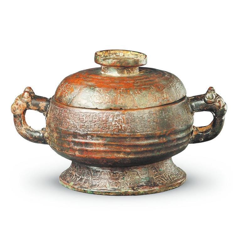 中國(guó)國(guó)家博物館收藏的秦公簋,1921年甘肅天水出土,簋呈圓形,蓋與器身相合成一略扁而圓的形體,蓋頂有圓形捉手,蓋邊緣及器口下飾勾連形蟠螭紋。蟠螭紋又稱交龍紋,流行于春秋中晚期至戰(zhàn)國(guó)早期,有一種由兩條或兩條以上小龍相交,組成紋飾單元,密布于器物表面。