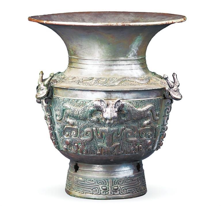 中國(guó)國(guó)家博物館收藏的龍虎紋青銅尊,高50.5厘米,重26.2千克,為一件體形較高大的盛酒器。青銅尊肩部以圓雕和浮雕相結(jié)合,塑造3條生動(dòng)的蟠龍形象,龍身蜿蜒,龍首探出,額有雙角,闊吻巨口,兩眼大睜。腹部紋飾為一個(gè)虎頭兩個(gè)虎身,虎口之下有一人形,人頭銜于虎口之中?;⑸硐路揭造槔鉃榻?,飾兩夔龍相對(duì)組成的獸面。從主體花紋看,龍、虎、人造型莊嚴(yán)穩(wěn)重、奇特神秘,特別是龍頭和虎頭用澆鑄法從外壁突兀凸起,雄健粗獷,比起用高浮雕法更具有一種威武逼人的悍氣。龍虎尊圓形大口表示上天,肩部神龍游蕩于空中;猛虎張牙舞爪守護(hù)大地。龍虎尊的鑄造采用十八塊母范經(jīng)兩次焊接而成,渾然一體,毫無痕跡。整器工藝精湛,花紋線條洗練,是商代青銅器中的精品。