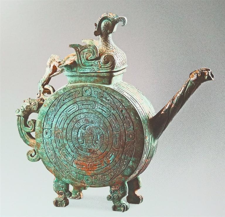陜西寶雞出土的逨盉,酷似現(xiàn)代的扁圓形壺,器身呈扁圓形,長(zhǎng)方形口上有鳳鳥形蓋。鳳鳥引首高昂,喙微卷曲,振翼欲飛。器身與蓋用虎形鏈及雙環(huán)相連,虎作向上爬行狀,頭左偏而尾上卷。直管狀流,流端作龍首狀。鋬呈龍首向下噴水狀,下有四獸足。腹部?jī)蓚?cè)紋飾相同,分別由三圈組成,由外向內(nèi)依次為變體夔龍紋、重環(huán)紋和蟠龍紋。逨盉是祭祀禮器,它將天上飛的鳳鳥、地上跑的猛虎、水里游的蛟龍,作為溝通天地、人神的使者,使天地人三者合而為一。由于周人將動(dòng)物視為具有無限神力之神靈,因此青銅器上之動(dòng)物紋樣,除宗教祭祀意涵外,也富有一定的政治意義。貴族通過青銅器上神秘肅穆的動(dòng)物紋樣,令人望之崇敬生畏,以威嚇被統(tǒng)治者,達(dá)到鞏固本身地位及權(quán)威之目的,同時(shí)也含有龍騰虎躍鳳呈祥的美好寓意。