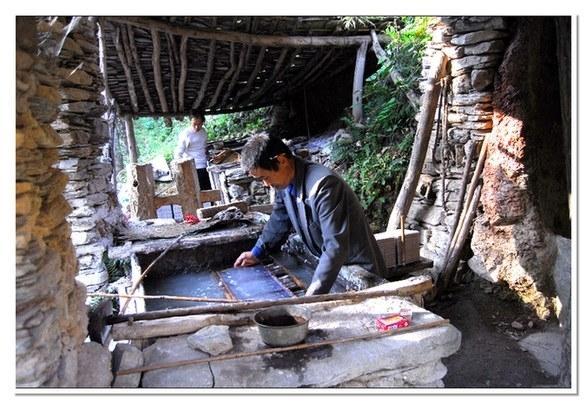 走到山麓,我們看到晶亮的小溪像一條小蛇蜿蜒而來(lái),一個(gè)用石頭砌起的水潭上,用幾根木頭支起漁網(wǎng)一樣的物件,水潭上有一間同樣用石頭砌成的操作間,屋頂用石板苫蓋,四周張著篷布遮蔽陽(yáng)光,這就是傳說(shuō)中的紙坊嗎?