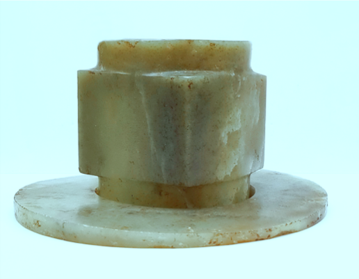 玉琮(編號總0128:1)高4~4.2厘米,外方邊長6.1~6.3厘米,內(nèi)徑5.2厘米,上端射較長,下端射極短,形制原始古樸,切割改制的現(xiàn)象明顯。