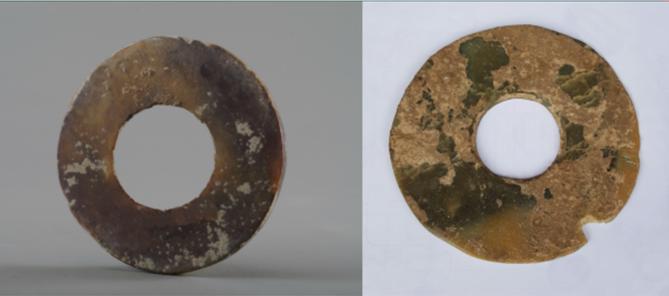 胡家底遺址發(fā)現(xiàn)的三對玉璧和玉琮,每對材質(zhì)基本相同,玉璧中孔可套疊在琮之射端,可見當(dāng)年有可能套疊使用以祭祀天地。