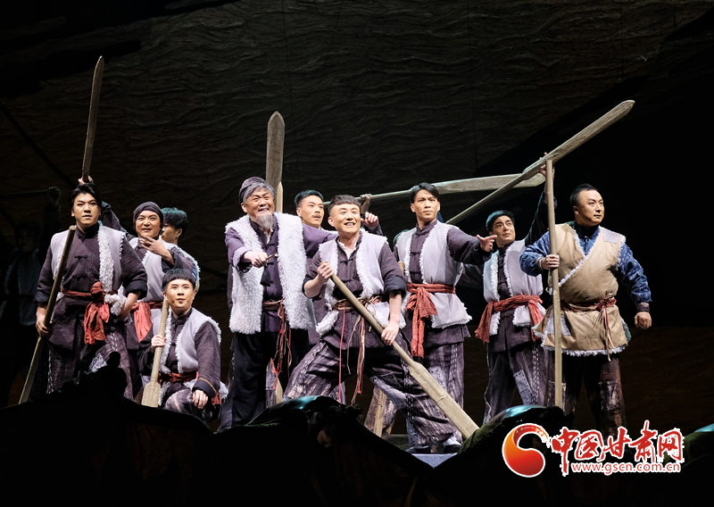 首演當(dāng)晚,一曲黃河特色的“花兒”開場,將觀眾帶回到20世紀(jì)30年代末蘭州筏客子在黃河激流中勇敢拼搏的時(shí)代。劇中,筏客子們在經(jīng)歷了碼頭爭奪、蘭州遭受日軍轟炸、金城壯烈犧牲等重重考驗(yàn)后,在國家危難時(shí)刻,舍棄個(gè)人恩怨,團(tuán)結(jié)起來支援抗戰(zhàn),組成水上大型運(yùn)輸隊(duì),將大量物資安全送達(dá)抗戰(zhàn)前線。