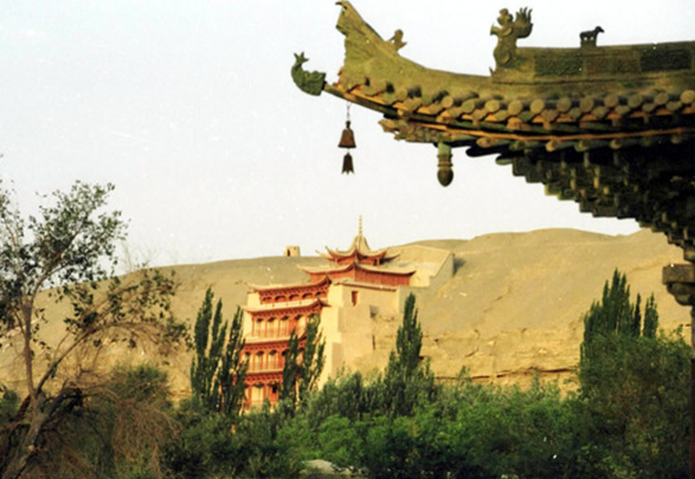 從20世紀(jì)70年代末開始,大量先進(jìn)科技不斷被引入敦煌石窟保護(hù)。新技術(shù)、新材料、新手段的不斷運(yùn)用,豐富了敦煌遺產(chǎn)的保護(hù)技術(shù)和保護(hù)手段,有效改變了石窟內(nèi)部及其環(huán)境的保護(hù)狀況,使敦煌遺產(chǎn)的保護(hù)工作從原來的搶救性保護(hù),過渡到了科學(xué)保護(hù)階段。圖為透過敦煌莫高窟前的牌樓一角望去,敦煌莫高窟標(biāo)志性建筑九層樓依舊雄偉壯觀。新華社記者梁強(qiáng)攝(2004年10月25日發(fā))