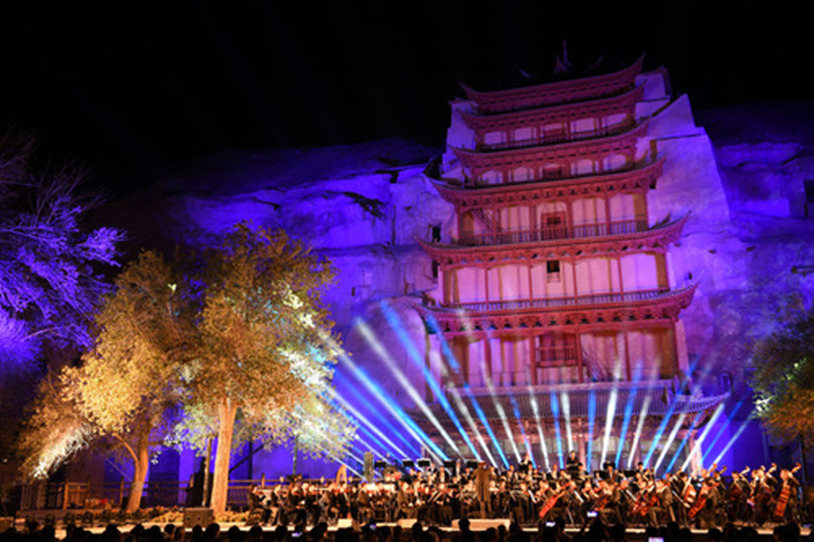 2016年9月15日,首屆絲綢之路(敦煌)國際文化博覽會系列活動之一的敦煌莫高窟1650周年紀(jì)念音樂會在莫高窟舉行。著名指揮家陳燮陽、特邀音樂家趙聰?shù)人囆g(shù)家奉上了具有絲綢之路沿線諸國特色的經(jīng)典曲目,2000余名觀眾在莫高窟九層樓廣場前追憶絲綢之路的璀璨歷史,聆聽穿越古今的藝術(shù)交響。