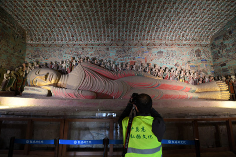 2016年10月11日,百名攝影師分組分批走進(jìn)甘肅敦煌莫高窟洞窟內(nèi)部進(jìn)行攝影創(chuàng)作,領(lǐng)略莫高窟神韻。圖為當(dāng)日,攝影師在敦煌莫高窟第148窟拍攝臥佛。新華社記者范培珅攝
