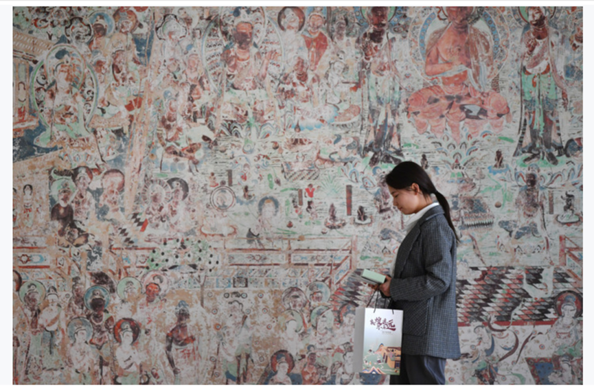 圖為敦煌研究院文物數(shù)字化保護(hù)團(tuán)隊(duì)創(chuàng)意營銷人員廖雪婷從一幅高保真復(fù)制壁畫前走過(2023年4月25日攝)。新華社記者陳斌攝