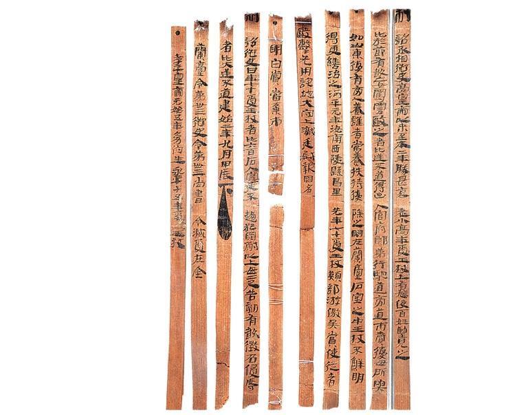 王杖簡,漢代,出土于武威市磨咀子漢墓。共計(jì)10枚,松木削制。兩道編繩,先書后編;墨書隸體,字跡清晰。每枚簡容字多者37字,少者6字,共240字。其內(nèi)容記載了東漢永平十五年(72年)幼伯受王杖事,并錄建始二年(前31年)九月“年七十受王杖”的詔書與河平元年(前28年)毆擊王杖主當(dāng)棄市的令。