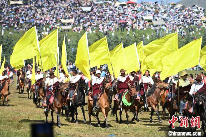 8月4日,藏族騎手在當周草原上表演馬隊巡游。當日,第22屆九色甘南香巴拉旅游藝術節(jié)在甘肅省甘南藏族自治州當周草原開幕。人們身著節(jié)日盛裝載歌載舞、歡聚一堂,馬隊巡游、千人鍋莊舞等活動精彩上演。九色甘南香巴拉旅游藝術節(jié)既是民眾浪山聚會的節(jié)日盛會,也是展現發(fā)展成就、擴大對外開放的重要窗口,更是展示民俗文化、促進廣泛交往交流交融的有效載體。中新社記者 九美旦增 攝