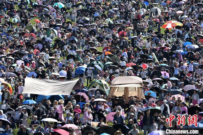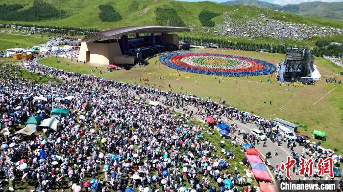 8月4日,第22屆九色甘南香巴拉旅游藝術節(jié)在甘肅省甘南藏族自治州當周草原開幕。人們身著節(jié)日盛裝載歌載舞、歡聚一堂,馬隊巡游、千人鍋莊舞等活動精彩上演。九色甘南香巴拉旅游藝術節(jié)既是民眾浪山聚會的節(jié)日盛會,也是展現發(fā)展成就、擴大對外開放的重要窗口,更是展示民俗文化、促進廣泛交往交流交融的有效載體。圖為開幕式現場。中新社記者 九美旦增 攝