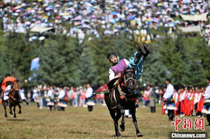 8月4日,藏族騎手在當周草原上表演馬術。當日,第22屆九色甘南香巴拉旅游藝術節(jié)在甘肅省甘南藏族自治州當周草原開幕。人們身著節(jié)日盛裝載歌載舞、歡聚一堂,馬隊巡游、千人鍋莊舞等活動精彩上演。九色甘南香巴拉旅游藝術節(jié)既是民眾浪山聚會的節(jié)日盛會,也是展現發(fā)展成就、擴大對外開放的重要窗口,更是展示民俗文化、促進廣泛交往交流交融的有效載體。中新社記者 九美旦增 攝