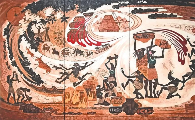 在《中國彩陶》這件作品中,通過對彩陶紋樣的想象,在構(gòu)圖上使用類旋紋的曲線來分割空間,分別表現(xiàn)了祭祀、種植、建筑、制陶、捕魚、狩獵、采集、馴化等情景。考慮到陶片所獨有的啞光質(zhì)感和其悠久的文化底蘊與作品的主題相吻合,故決定使用陶片結(jié)合傳統(tǒng)的大漆工藝進行鑲嵌,使作品在內(nèi)容與形式上達到統(tǒng)一。