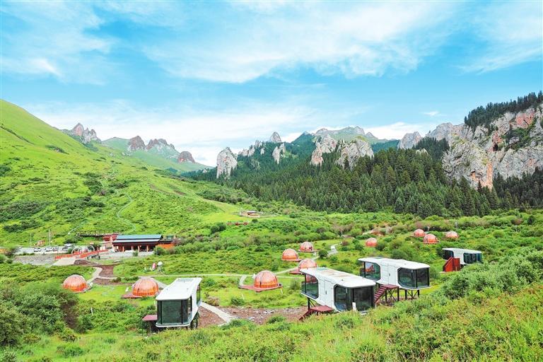 夏河縣的??撇菰?,游人在山間草場(chǎng)、樹林河邊支起一頂頂帳篷,白天品著飄香的奶茶,晚上躺在草地上仰望星空,很是愜意。