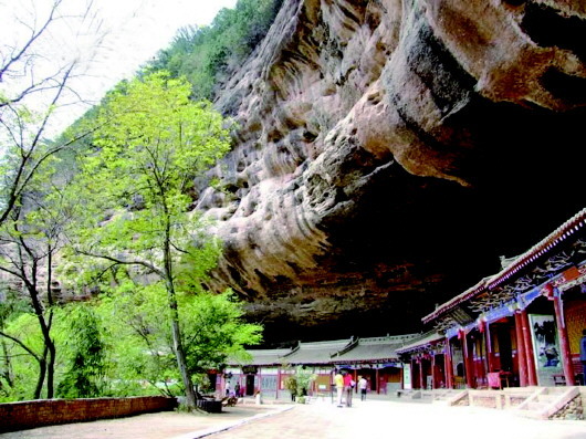 那天,自然之神行走于隴山渭水間,他雙手揮動(dòng),如雕如塑,將山川大地刻畫(huà)得瑰麗而神奇。當(dāng)他完成麥積山的杰作后,輕輕一拂指尖,卻不小心將一座砂崖的底部抹去,使之形成一面巨大的石檐。這石檐下,形狀恰似蛤蟆之嘴,能藏千軍萬(wàn)馬,充滿(mǎn)了神秘與威嚴(yán)。
