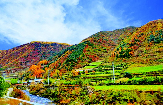 秋日的渭川大地,以非凡的姿態(tài)喚醒最美的山川河流,繪就一幅又一幅的秋日七彩山水畫卷。秋景中的龍臺鎮(zhèn),就是畫卷中最美的詩和遠(yuǎn)方。秋葉隨風(fēng)搖曳,村落掩映群林,溪水潺潺遠(yuǎn)去,炊煙裊裊升起。在馬年云梯之上遙望太皇山巍峨雄壯,重巒疊嶂。由深紅、金黃、橙紅、翠綠交織在一起的秋日勝景,與藍(lán)天白云相映成趣,顯得壯麗無比。