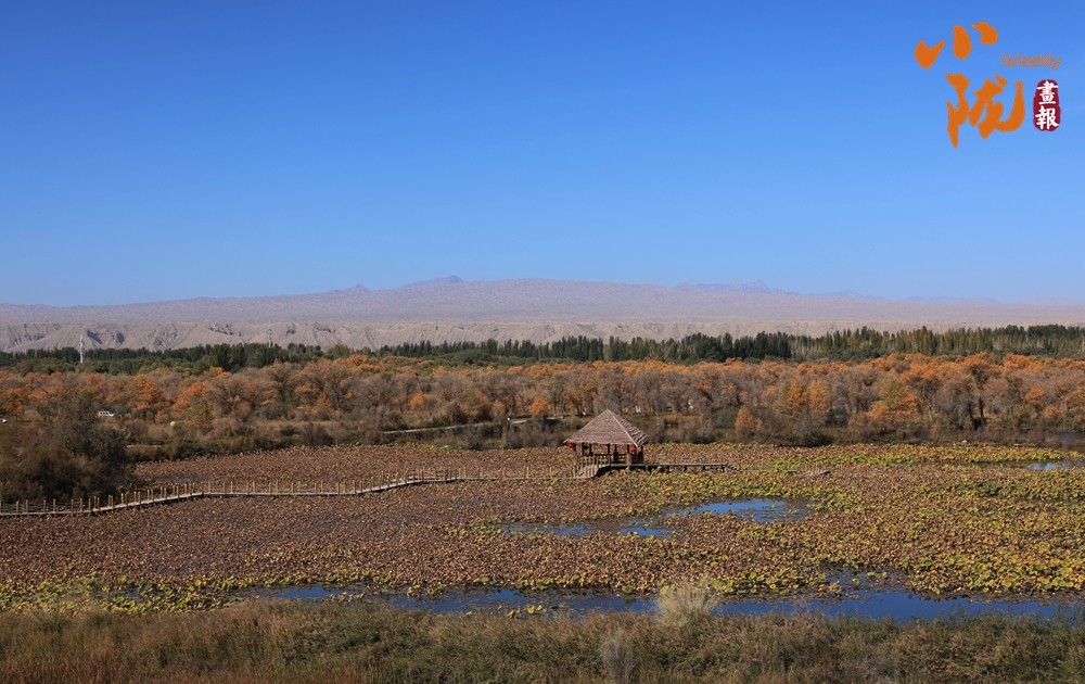 一大片荷花池,因?yàn)槭巧钋?,池?nèi)的荷葉已經(jīng)枯萎,變成金黃色,與周邊的金胡楊相映成趣。蒼勁的胡楊,高雅的荷花在此結(jié)緣。葦草繁茂,野花盛開,置身其中,仿佛走進(jìn)金色的海洋。