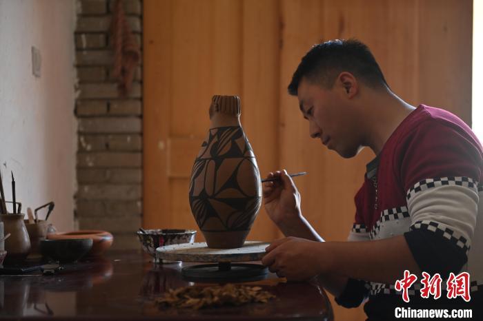 4月11日,甘肅省天水市秦安縣康坡村陶藝車間內,甘肅省級非物質文化遺產名錄秦安陶器燒制技藝天水市級傳承人康曉龍趕制大地灣文創(chuàng)彩陶。李亞龍 攝