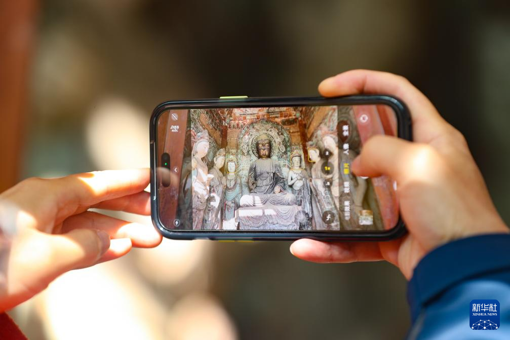 11月2日,游客在麥積山石窟參觀游覽時(shí)用手機(jī)拍攝開放洞窟彩塑。新華社記者 郎兵兵 攝