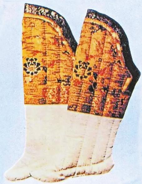 漢代的“夾襪”就是一種棉襪,這種襪子較單層襪厚實,里外兩層,故名。湖南長沙馬王堆漢墓中曾出土過兩雙夾襪,由雙層素絹縫成,襪面用絹較細,襪里用絹較粗。這是女襪,出土時放置在棺木邊箱的竹笥之內,從襪子當隨葬品來分析,那時襪子已是生活中必備衣物。
