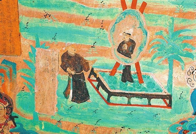 戰(zhàn)國(guó)時(shí)期楚國(guó)詩(shī)人屈原在《漁父》一文中寫道:“吾聞之,新沐者必彈冠,新浴者必振衣。安能以身之察察,受物之汶汶者乎?”意思是說我聽說剛洗過頭的人一定會(huì)去彈彈帽子上的灰塵;剛洗過澡的人一定要抖抖衣服的灰塵。怎能讓清白的身體去接觸世俗塵埃的污染呢?當(dāng)年的敦煌人走出溫泉,在身心放松之后,就該靜觀返照自己了。在莫高窟第85窟中有一幅“曲花式鏡圖”:畫面上在一個(gè)正方形鏤空的底座上擺放著一個(gè)巨大的曲花式鏡,鏡子式樣別致,明亮澄澈。藍(lán)色的曲花式樣引人矚目。但畫面上最吸睛的是一位魁梧俊朗身著一襲赭色長(zhǎng)袍的男子,他正在鏡子前仔細(xì)地打量自己,而鏡中映射出他神情凝重的情態(tài)來。原來,古人照鏡除了正衣冠之外,還有反觀自照的含義,在鏡子前良久地注視自己,就是對(duì)自己反省、頓悟的過程。“一年好景君須記”,走過四季,到了歲末,該是每個(gè)人回望來時(shí)路,展望前方的時(shí)候了。