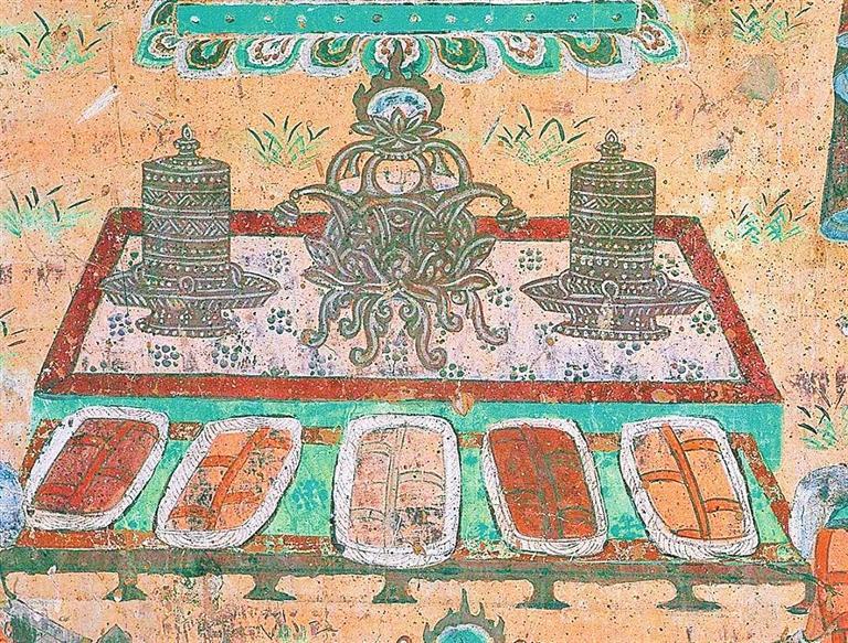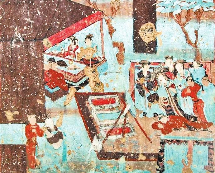 古人會(huì)在一年的歲末舉行一次集體聚會(huì),稱作“建福”。在敦煌文獻(xiàn)《社司轉(zhuǎn)帖》中寫道:“右緣常年建福一日,人各爐餅壹雙,凈粟壹斗。幸請(qǐng)諸公等,帖至限今月廿二日卯時(shí)于安家酒店取齊。”意思是說,只要有可能,每年到了年末大家都要選擇一日來進(jìn)行建福。每家每戶需要按時(shí)把準(zhǔn)備建福的物資送過來。唐朝詩(shī)人李白在《客中行》一詩(shī)中寫道:“蘭陵美酒郁金香,玉碗盛來琥珀光。但使主人能醉客,不知何處是他鄉(xiāng)。”意思是說蘭陵美酒甘醇甜美,就像郁金香一樣芬芳四溢。興來盛滿玉碗,泛出琥珀光晶瑩迷人。主人端出如此好酒,定能醉倒他鄉(xiāng)之客。飲酒之后哪能分清故鄉(xiāng)與他鄉(xiāng)呢?歲暮聚飲蘊(yùn)含有辭舊迎新、攘兇納吉的美好愿望。在莫高窟第12窟壁畫中有一幅“帳篷酒肆圖”:畫面中圍坐在條形長(zhǎng)桌兩邊正盡興暢飲的客人為七人,還有兩個(gè)熱情忙碌的服務(wù)人員。整個(gè)畫面是一幅酒酣耳熱、興致高昂的歡飲圖。更為氣勢(shì)恢宏、熱鬧非凡的是莫高窟第23窟壁畫中一幅“院落圖”:畫面中分院落之內(nèi)與院落之外兩個(gè)部分,院落之內(nèi)是世俗的世界,畫面上布局著鱗次櫛比的廳堂房屋,有人正在庖廚、有人正在對(duì)弈、有人正在暢聊、有人正在團(tuán)聚,也有人正在說教,總之表現(xiàn)的是我們?nèi)粘I畹陌賾B(tài)。院落之外是佛國(guó)世界,整體呈現(xiàn)出肅穆莊嚴(yán)之感。有趣的是在佛國(guó)與世俗世界中間,畫的是服飾艷麗,騎馬遠(yuǎn)行的人們。