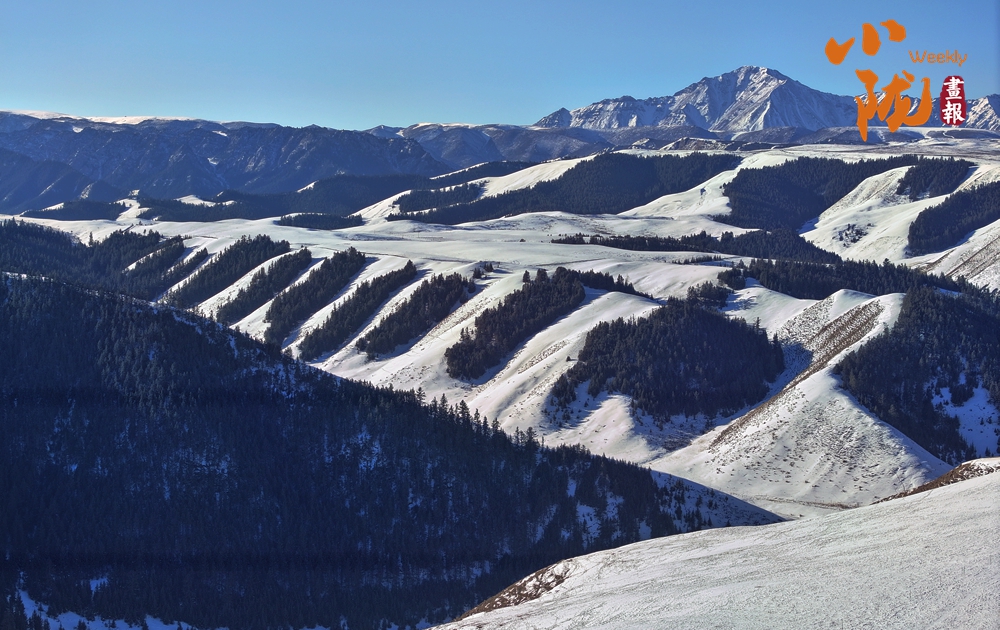 蒼茫草原,皚皚雪峰,松林相互映襯,構成一幅美麗的冬日畫卷。